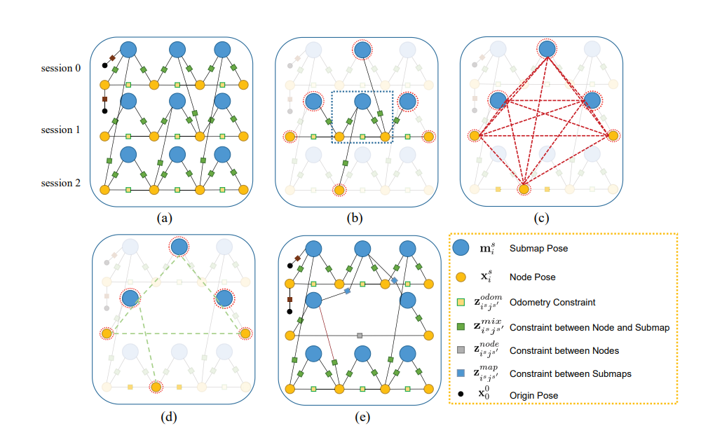 (a)-(b)-(c)과정은 Marginalization을 통해 node를 삭제하여 constraint가 생기는 과정입니다. (d)에서 graph Sparsification과정이 발생합니다.