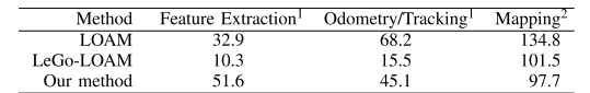 runtime을 비교해보면 feature를 뽑을 때는 확실히 curvature를 계산할 때보다는 많이 걸립니다. 이 논문에서는 Mapping module이 2.3Hz가 나온다고 하는데 이론상 최대 10Hz가 될 수 있다고 합니다.