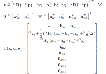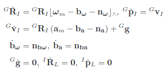 P는 IMU postion을 의미하고 R은 IMU attitude를 의미합니다. g는 중력 가속도, b는 IMU bias이고 n은 noise입니다. 왼쪽 위에 표지된 G는 frame을 나타내고 global frame이란 것을 말해주고 있고 I는 IMU frame을 의미합니다.