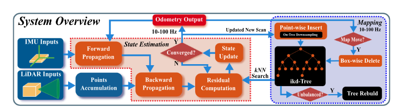 축적된 data는 scan으로 부르며 state estimation을 하기위해 point들은 iterated kalman filter를 통해 유지되는 map point에 등록되게 됩니다. Global map point들은 ikd-tree에 정렬됩니다. ikd-tree에서 옛날 데이터는 적절하게 삭제한 후 residual을 계산하는데 사용됩니다.