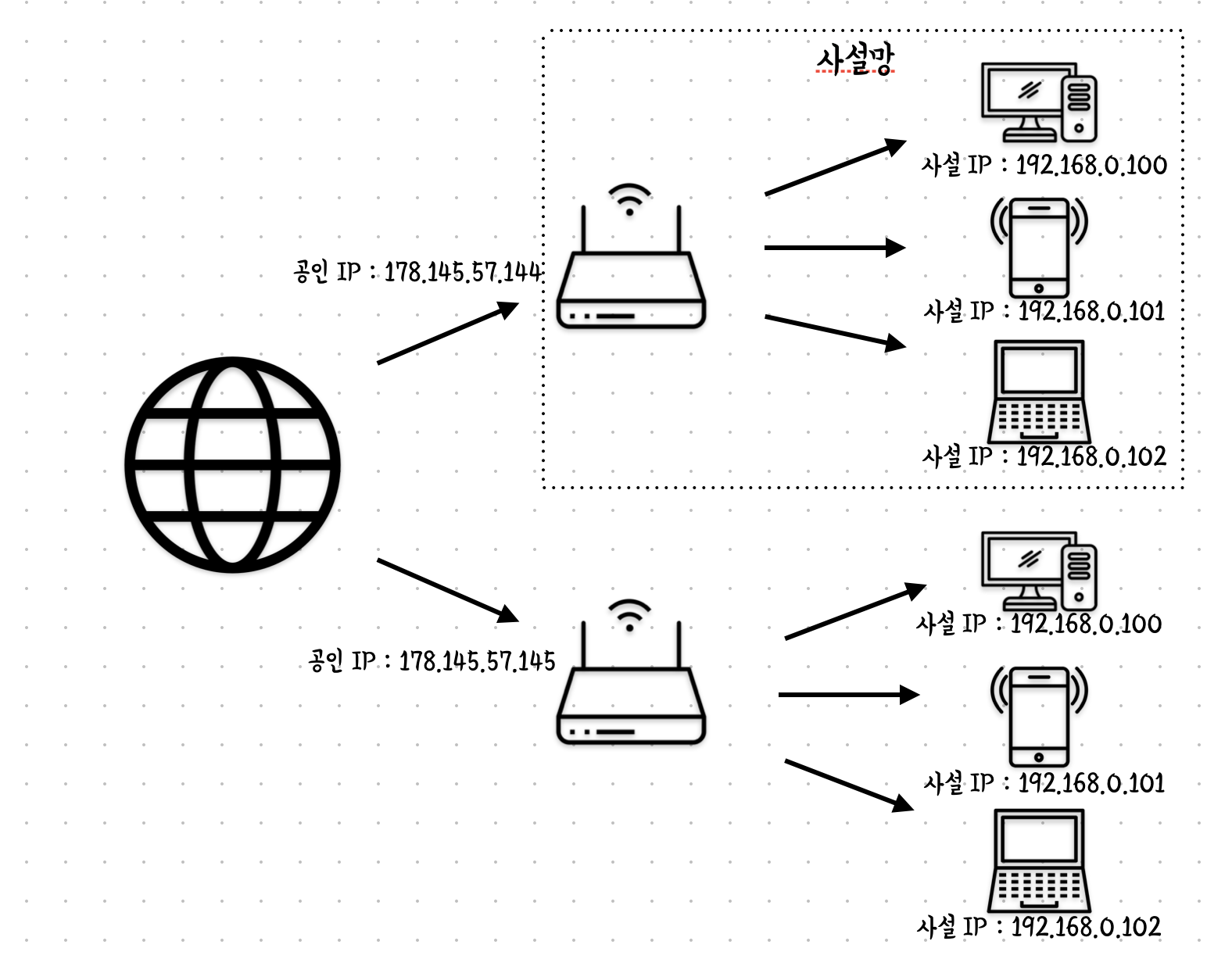 공인IP는 전 세계에서 유일하지만 사설IP는 하나의 네트워크 안에서 유일하다.