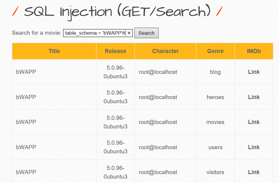 - database() : 데이터베이스 이름을 확인하는 함수 : bWAPP