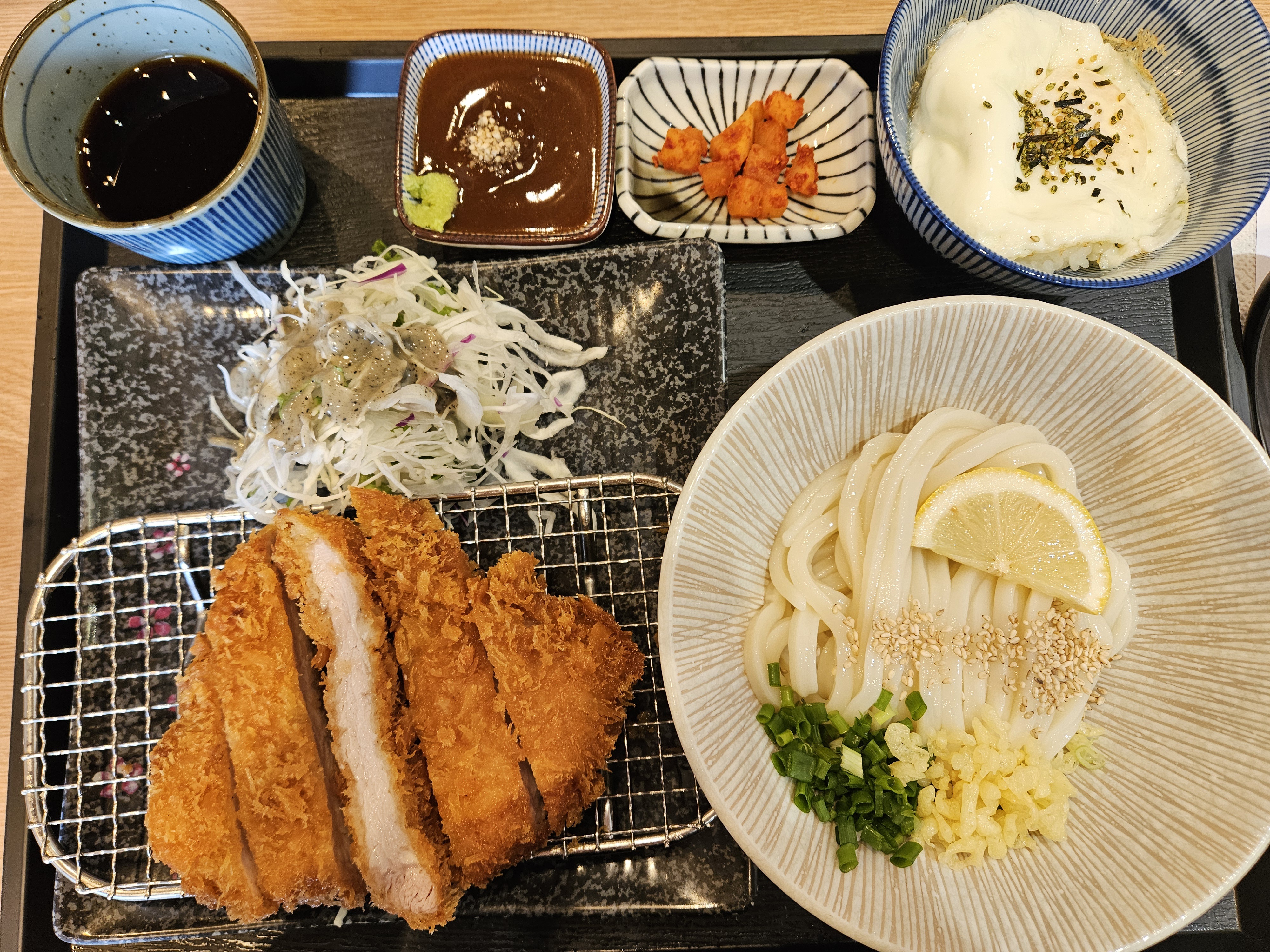 붓카케 우동에 레몬을 짜고 나니 싱그러운 레몬 향이 오래 머물렀다.🍋 붓카케 우동은 시원하고 쫄깃하니 맛있었다! 여름의 감각 가득한 맛이랄까~ 돈까스도 크고 두툼해서 좋았다.