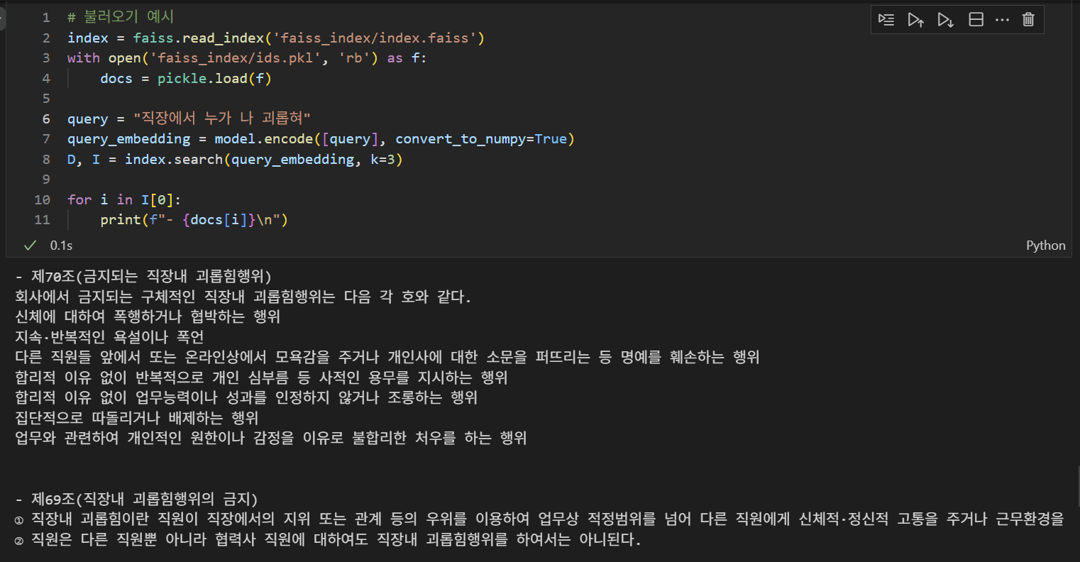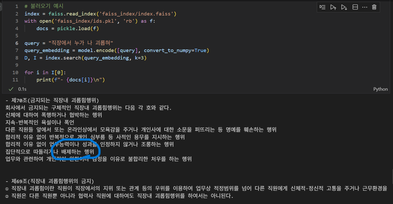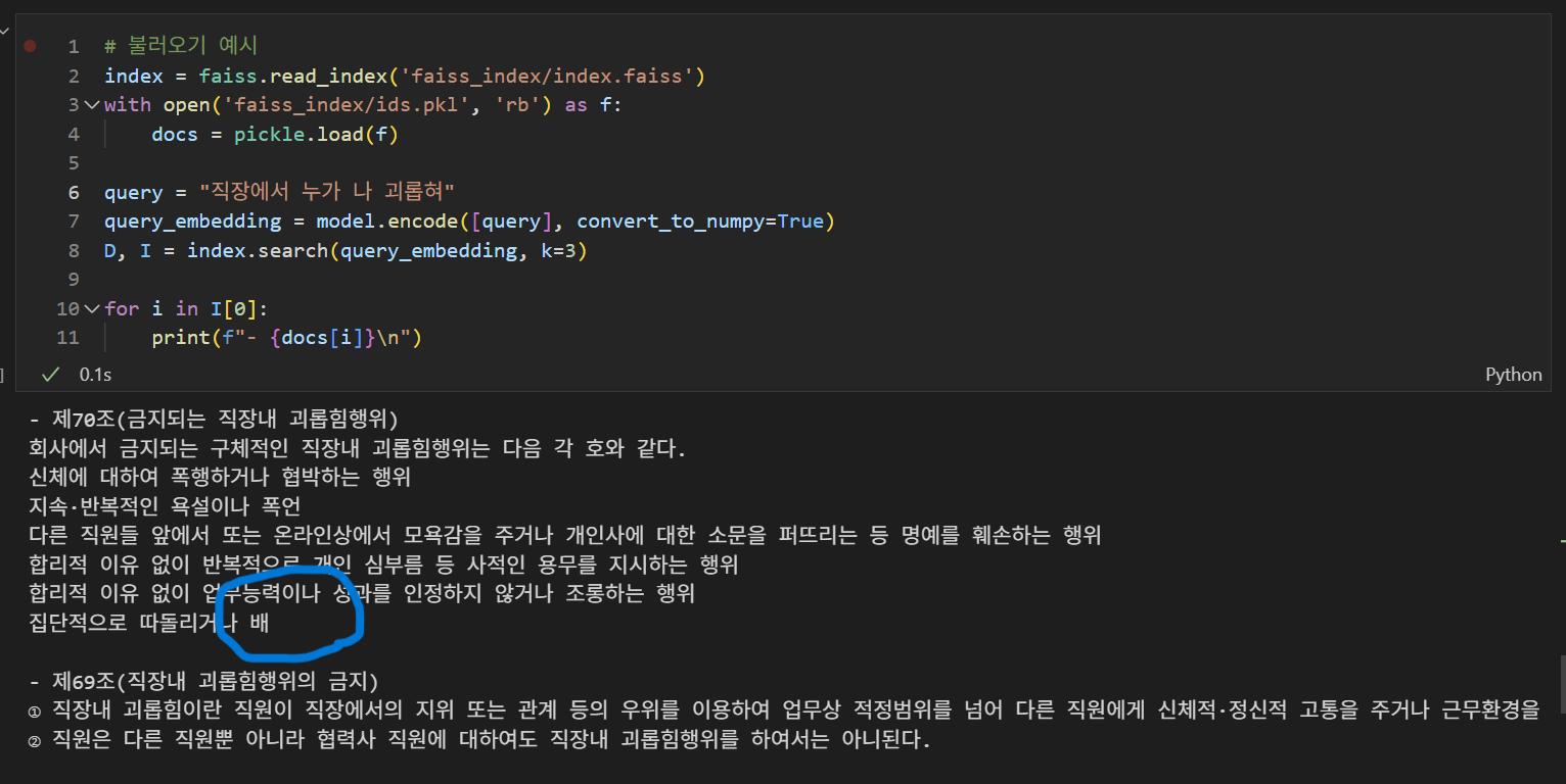검색해본 결과! '직장에서 누가 나 괴롭혀'라고 질문을 입력했을 때, 직장 내 괴롭힘 행위에 대한 문서들이 검색되는 걸 확인할 수 있다. 조항 단위로 문서를 분할해도 어느정도 나오는 것 같다. 더 상세한 포맷팅은 내일 얘기해보기로!