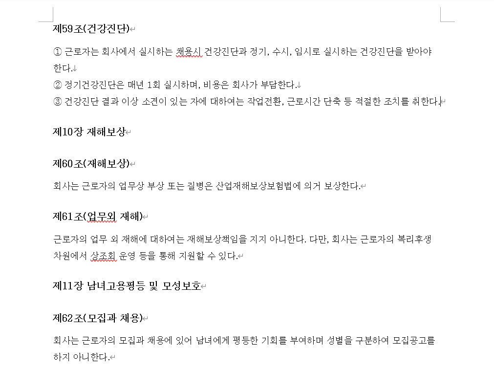 위는 팀에서 쓸 데이터 중 일부이다. 제10장 재해보상 아래 제60조(재해보상)가 있는, 장-조-항 구조이다.