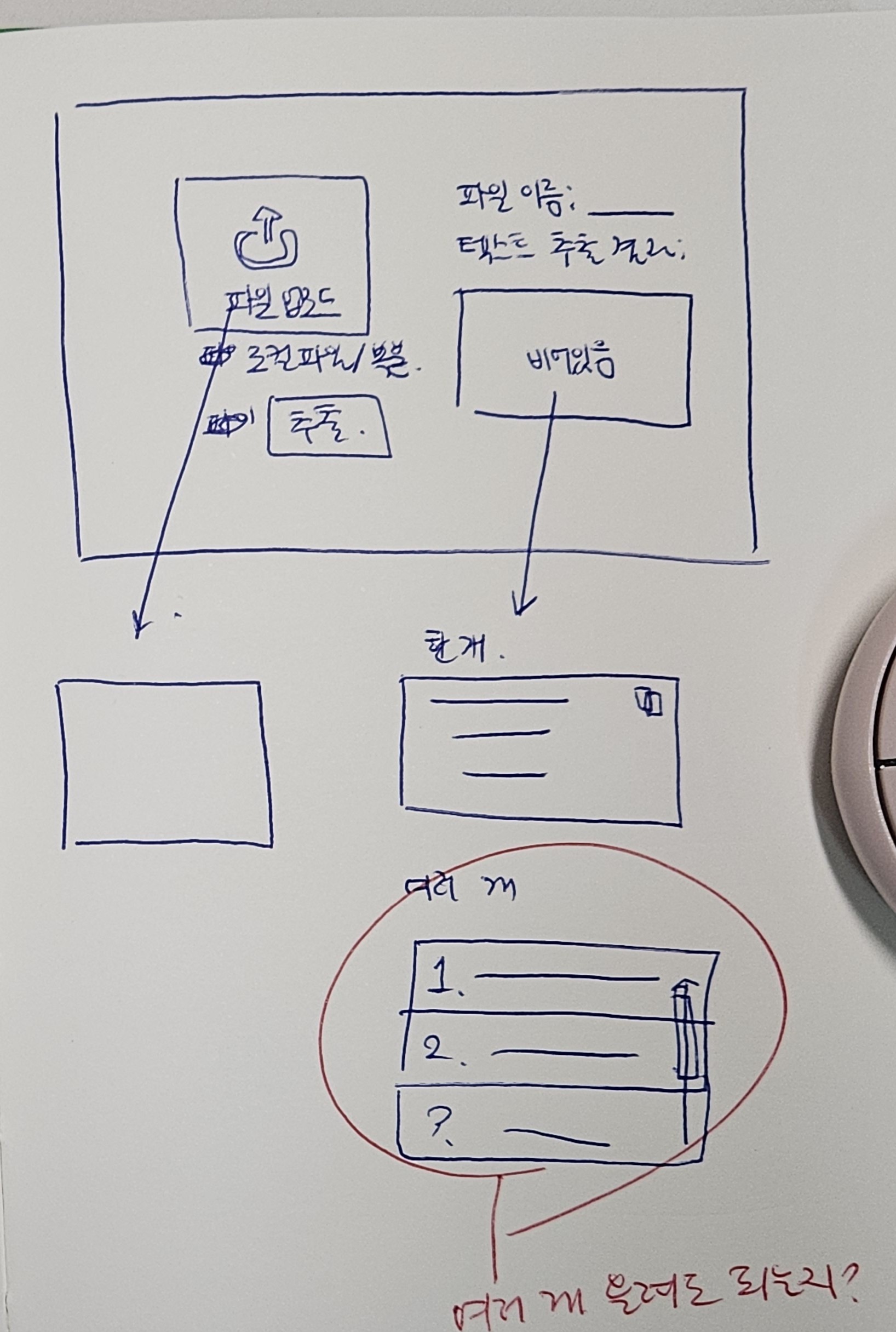 사진에서 보이듯, 화면을 구상하면서 '이미지 파일을 여러 개 올려도 되는지?'가 궁금해져서 팀원분들께 말씀드리니, 그럼 이미지 파일을 처리할 때 문서를 여러 개 넣을 수 있게끔 기능을 구현하는 것도 필요하겠다고 결론이 났다. 화면 구상을 하면서 적절한 아이디어를 제시한 것 같아 뿌듯하다~
