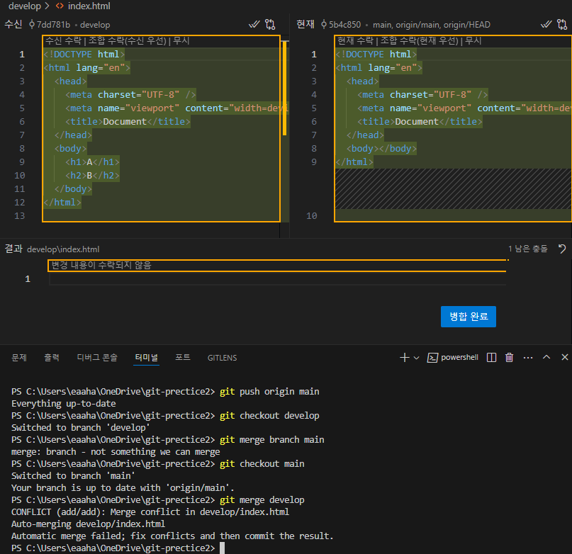 각각의 브랜치에서 파일 수정 이후 main 브랜치에서 git merge develop을 실행하니