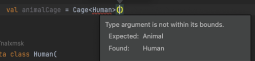 이렇게 되면 Animal 타입과 그 하위 타입을 제외한 다른 타입을 가진 Cage를 생성할 수 없게 됩니다. 컴파일 시점에 에러가 발생한다는 것도 알 수 있습니다.
