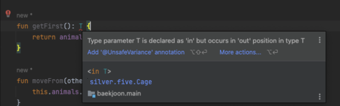 out 키워드를 작성했을 때는 에러를 발생하지 않았던 getFirst() 메서드에서 에러가 발생합니다.