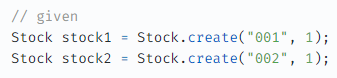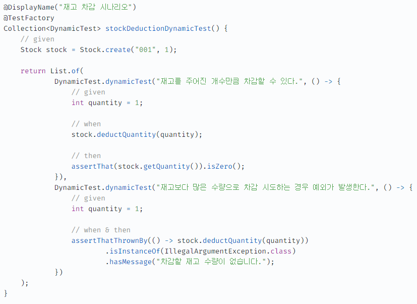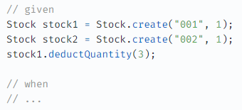stock1.deductQuantity(3); 에서 내부 로직을 파악하고 맥락을 이해해야만 하는 허들이 생긴다.deductQuantity() 내부에서 뭔가 로직이 있어서, 예외를 발생시키는 구문이 있다고 가정해보자. 그러면 테스트에서 when/then 절에서 테스트가 실패하는게 아니라, given 절에서 테스트에 실패하게 된다. 즉, 테스트 주제와 맞지않는 부분에서 테스트가 실패하는 것이다. ( 이렇게 되면, 만약 단순한 테스트 케이스가 아닌 복잡한 테스트 상황에서 테스트가 실패한 경우, 이게 왜 실패했는지 유추하기 어렵게 만드는 포인트가 될 수 있다. )