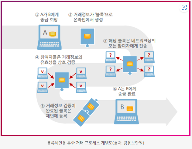 - 검증 : 네트워크의 노드들이 트랜잭션을 검증한다. 보통 이 과정에서 합의 알고리즘(예:PoW, PoS)을 사용한다.