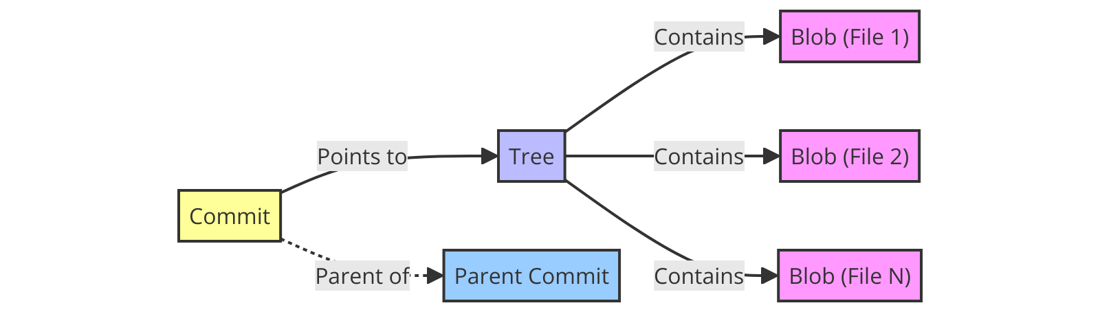 src/ 디렉토리와 README.md 파일이 있을 때, 이 구조는 트리 객체로 관리되며, src/ 디렉토리는 또 다른 트리 객체로, README.md 파일은 Blob 객체로 참조된다.