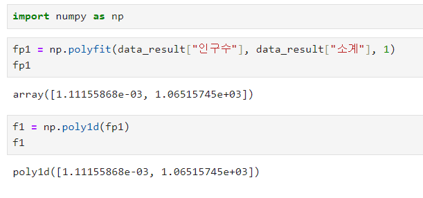np.poly1d : polyfit으로 찾은 계수로 파이썬에서 사용할 수 있는 함수로 만들어주는 기능