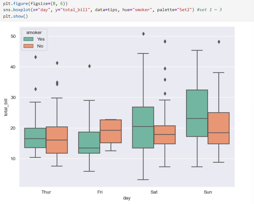 - palette="Set1" (set1~3)- hue :카테고리 데이터 표현 (컬럼을 지정하고 구분을 지을 수 있다.)