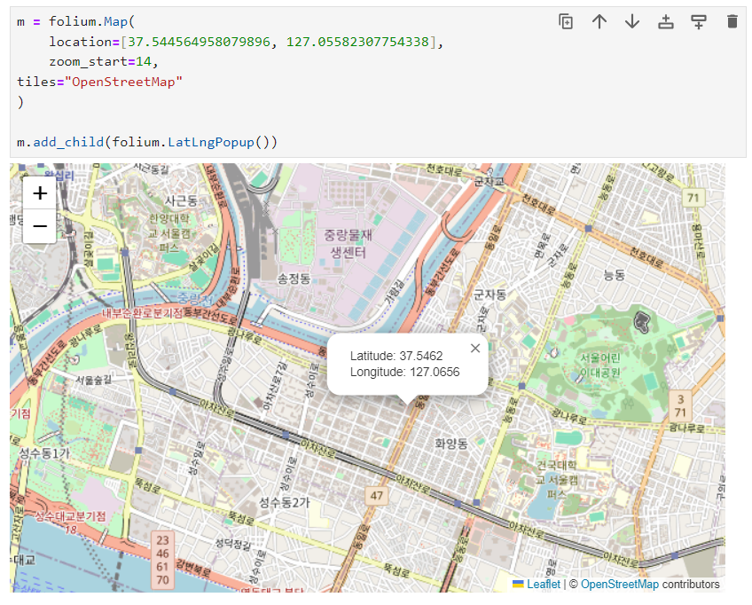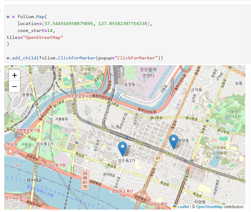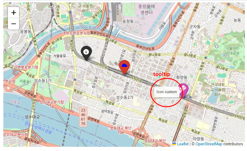 folium.Marker( location = [37.544564958079896, 127.05582307754338], popup="<b>Subway</b>", tooltip="<i>성수역</i>" ).add_to(m)folium.Icon()