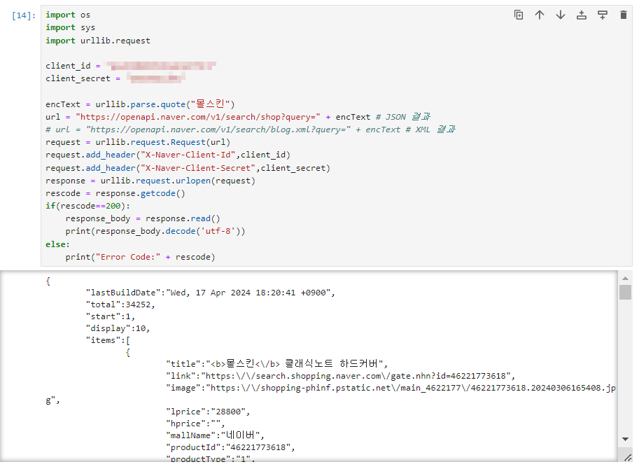 # url = "https://openapi.naver.com/v1/search/blog.xml?query=" + encText # XML 결과