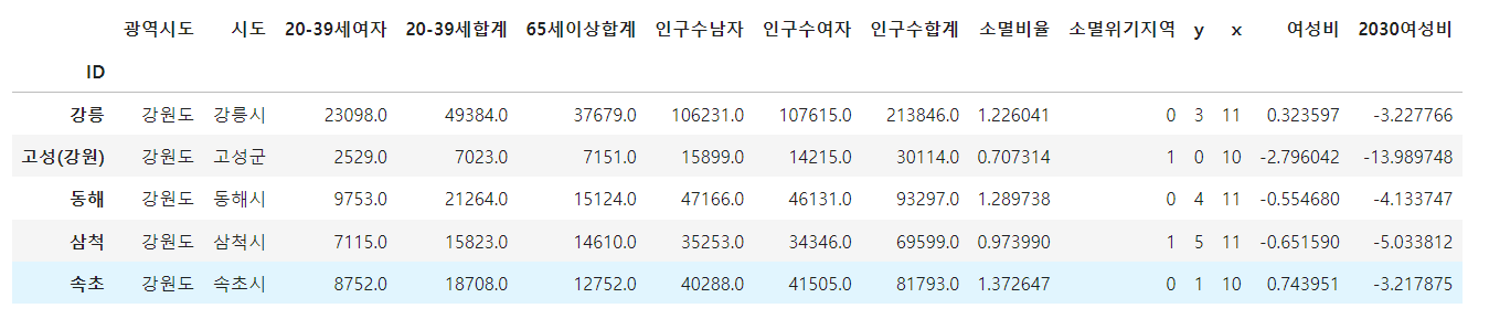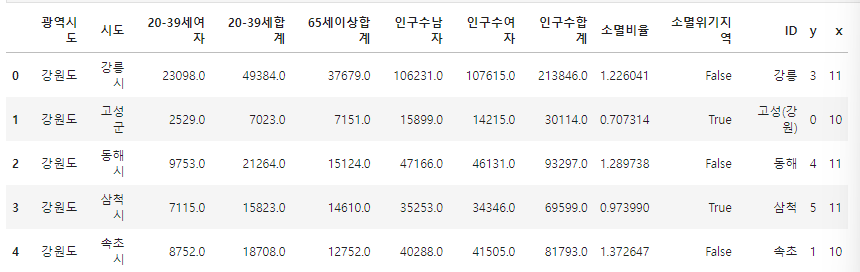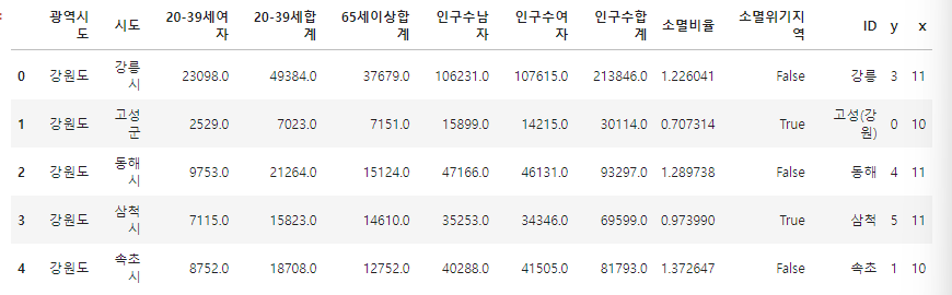 pop["소멸위기지역"] = [1 if con else 0 for con in pop["소멸위기지역"]]