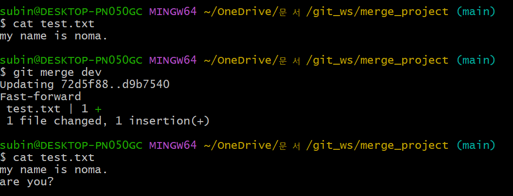 get merge : 현재 위치한 branch에 다른 branch를 병합