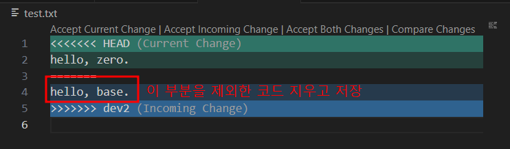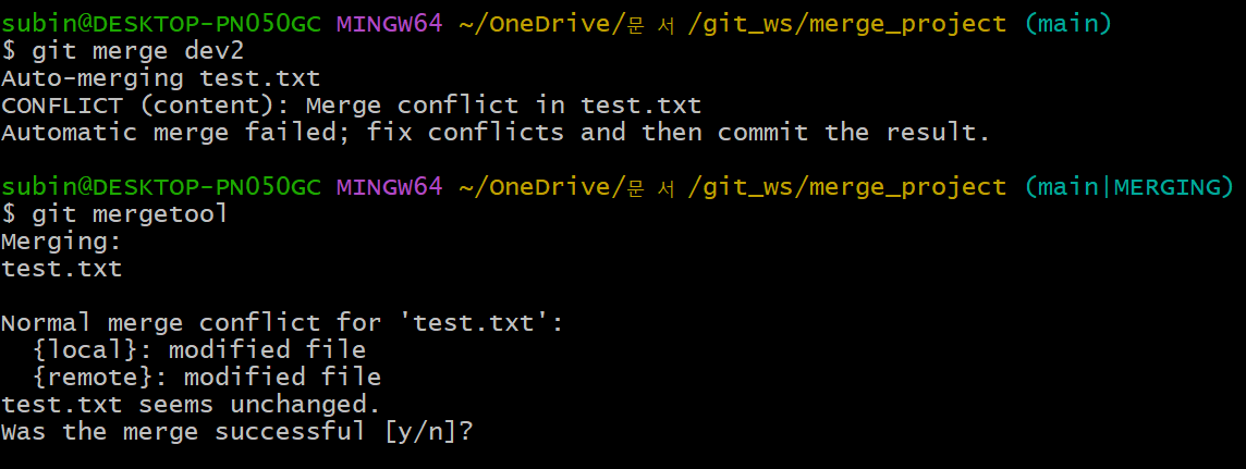 - 오류로 인해 mergetool 활용해서 vscode로 merge 하기