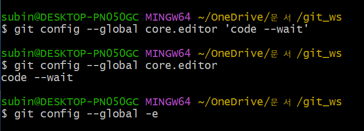 git config —global <core.editorname> —wait (—wait : command 대기)