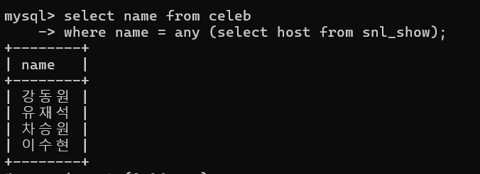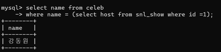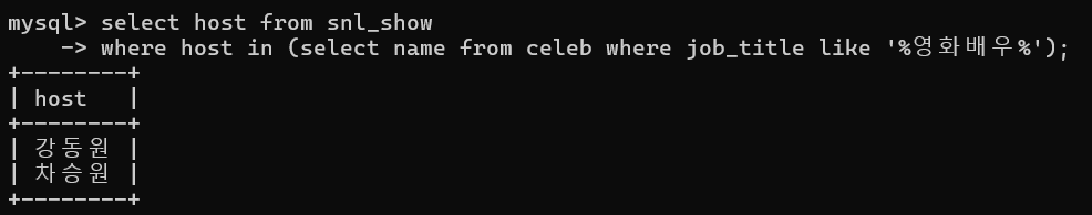 - 예제 : snl에 출연한 적이 있는 연예인 이름 조회