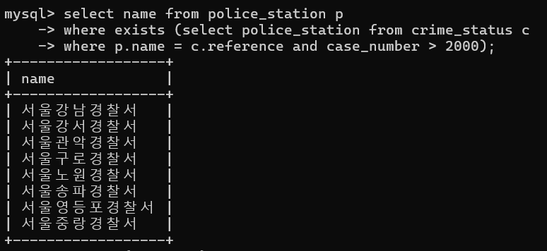 - 예제 : 범죄 검거 혹은 발생 건수가 2000건 보다 큰 경찰서 조회