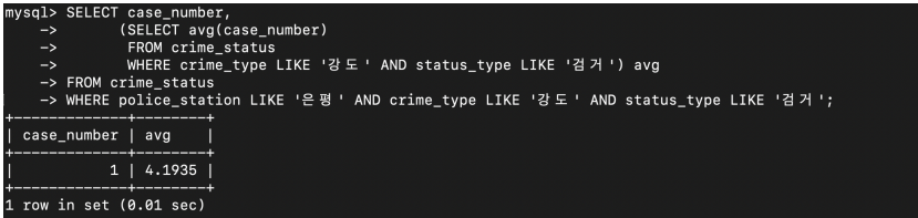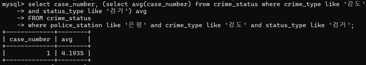 - 예제 : 서울 은평경찰서의 강도 검거 건수와 서울시 경찰서 전체의 평균 강도 검거 건수를 조회