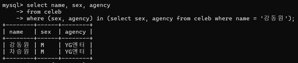 - 예제 : 강동원과 성별, 소속사가 같은 연예인의 이름, 성별, 소속사를 조회