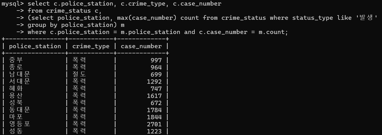 - 예제 : 경찰서 별로 가장 많이 발생한 범죄 건수와 범죄 유형을 조회
