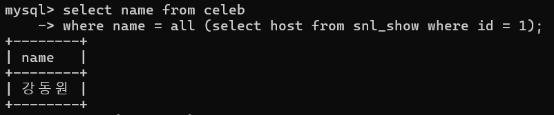 - 서브쿼리 결과를 모두 만족하면 (비교연산자 사용)