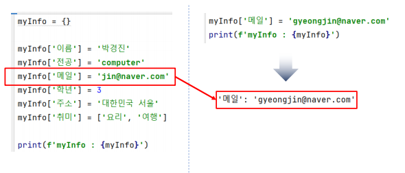 딕셔너리 추가 : ‘딕셔너리이름[key] = value’ 형태로 아이템 추가