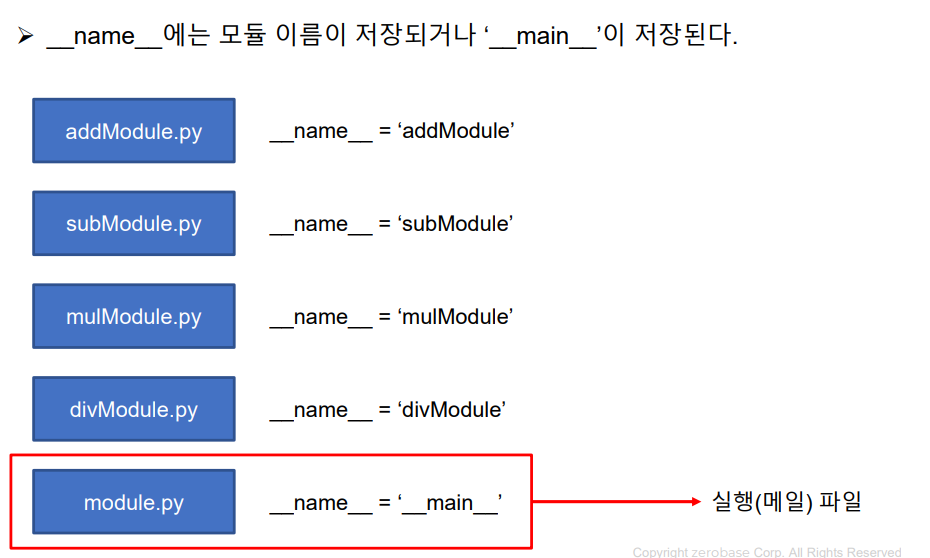 ‘__main__’: 해당 파일은 프로그램의 시작 파일 = 실행 파일 (많은 파일 중에 실행 파일을 찾아가기 좋음)if __name__ == '__main__': ⇒ 실행 파일이 메인일 경우에만 실행하는 구문package : 모듈을 묶어서 관리할 수 있다. 관련 있는 모듈을 그룹으로 관리할 수 있다.