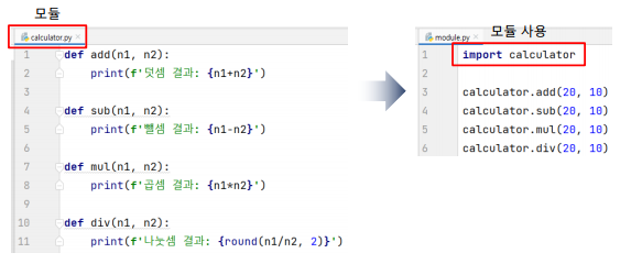 => 파이썬 파일을 모듈로 만들어 import + 파일명(모듈명)으로 사용