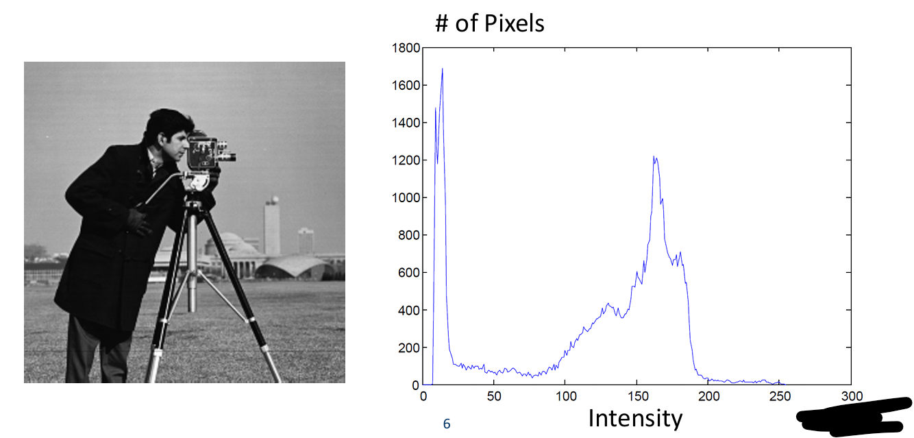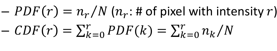 PDF: 확률밀도함수: histogram을 정규화한것 : 각 intensity가 등장할 확률을 나타냄