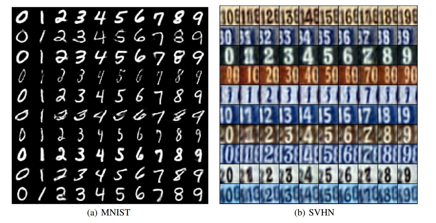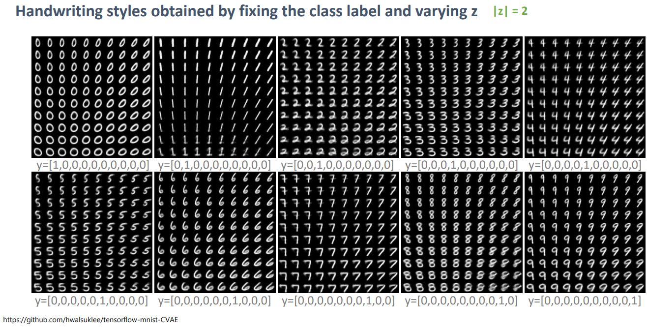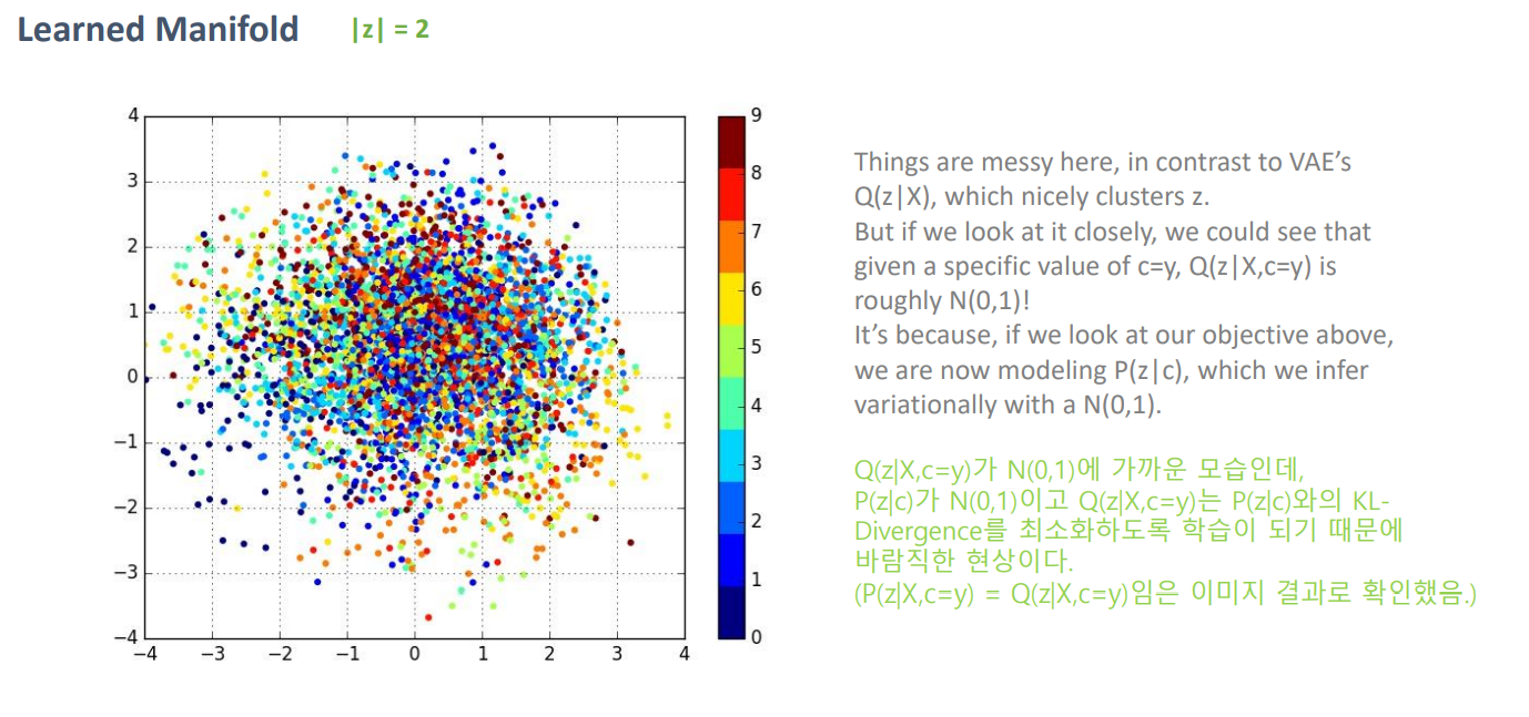 위 결과를 해석해보면 condition으로 label을 주었을 때 내가 원하는 manifold에 mapping되었다 라고 해석할 수 있습니다. 즉, Mnist의 숫자별로 다른 위치에 mapping한거죠.