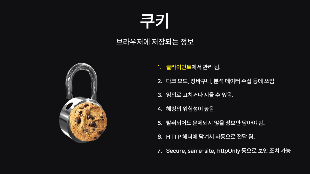 이 중에서는 쿠키가 상대적으로 보안 옵션이 다양하여 보안성이 높은 편이지만,