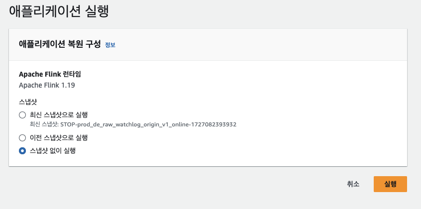 - Flink 앱을 중단 후 재실행 시키면, 이전 스냅샷, 체크포인트 상태를 기준으로 이어서 작업하게 된다.