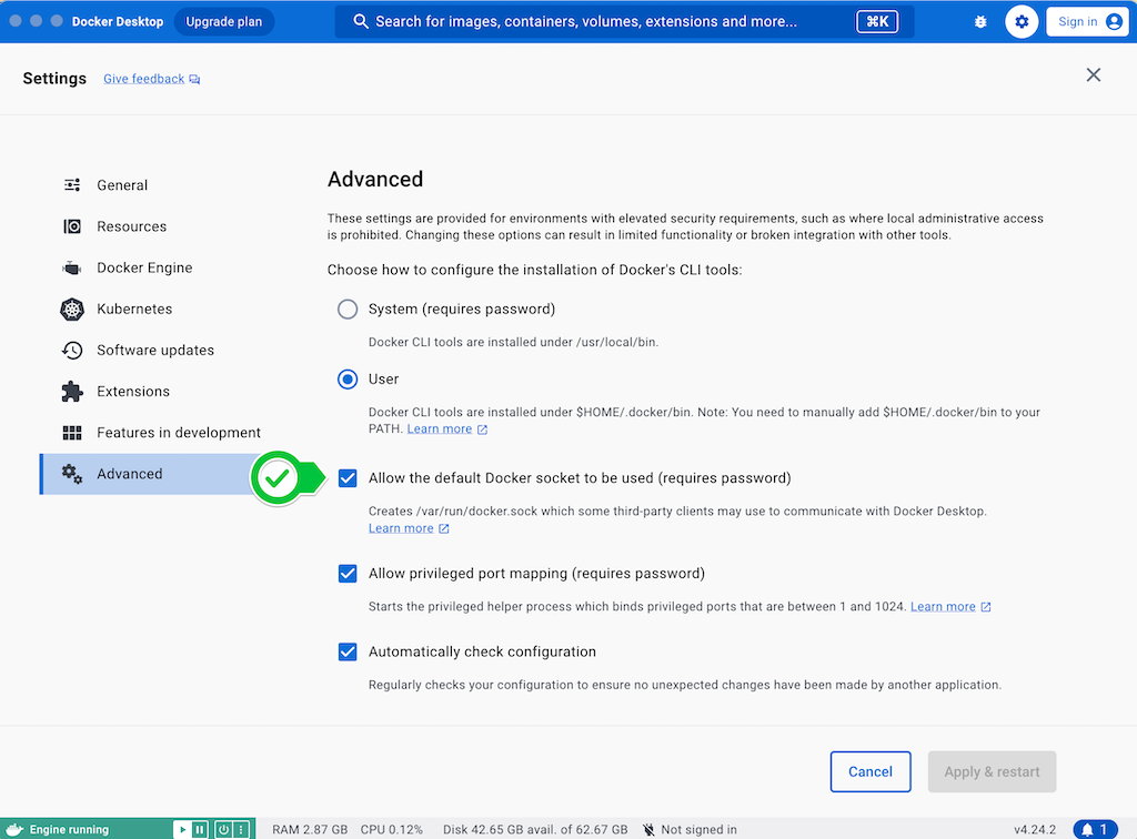 In Docker Desktop: Settings > Advanced > Allow the default docker socket to be used : enable