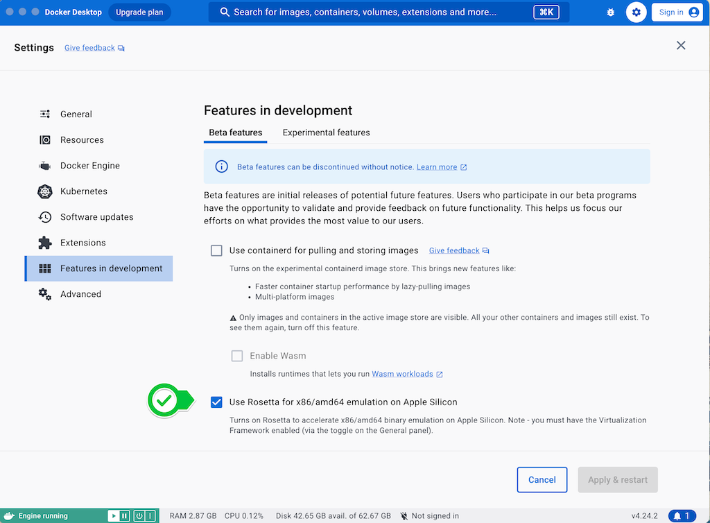 Enable Rosetta emulation in Docker, to run on Apple Silicon Mac images for Intel architecture.