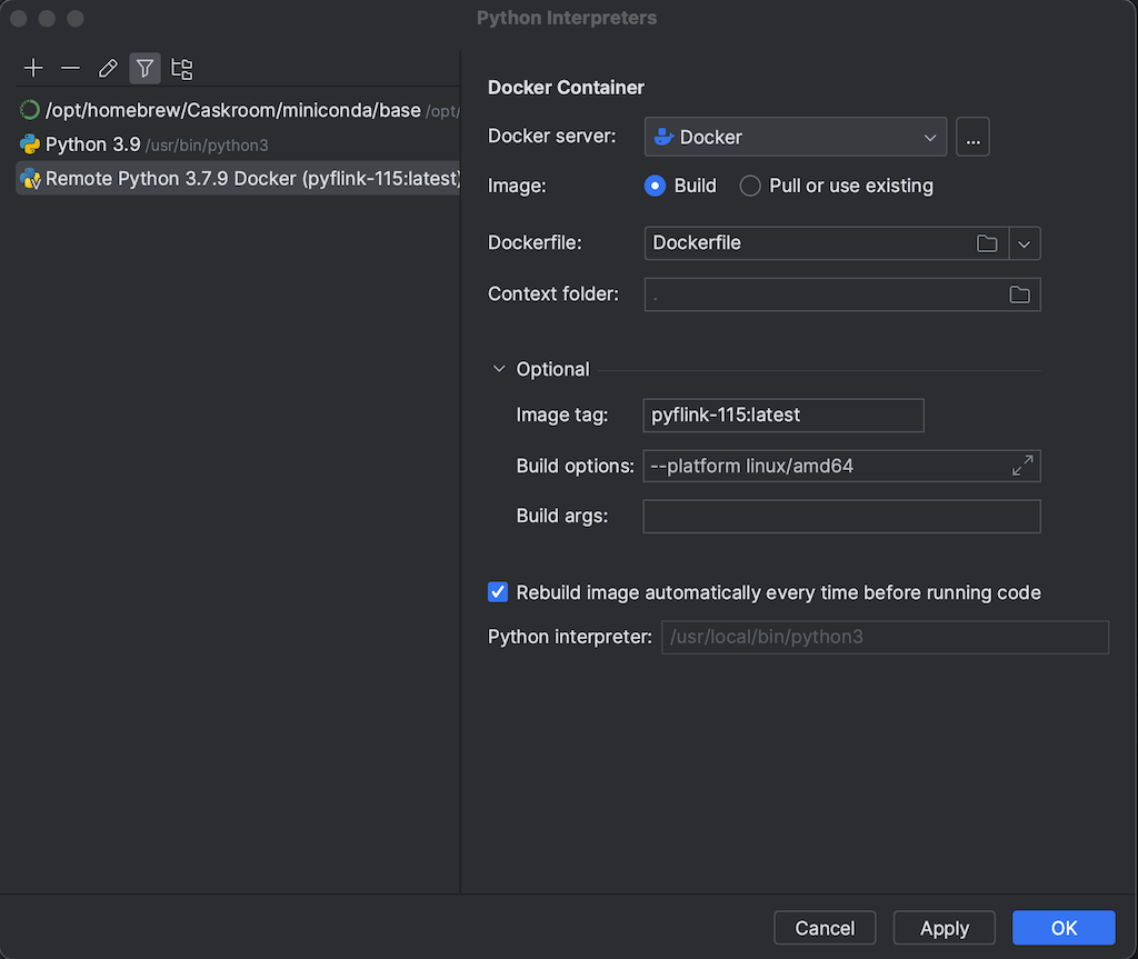 docker build --platform linux/amd64 --tag pyflink-115:latest .