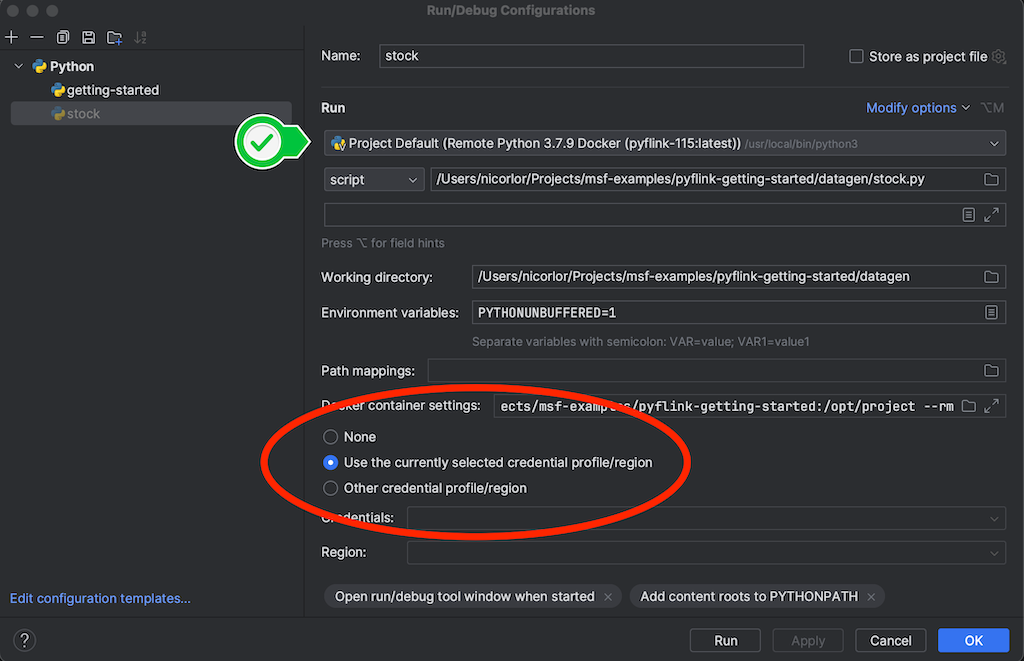 Also configure the script Run Configuration accordingly, e.g. to “Use the currently selected credential profile/region”.
