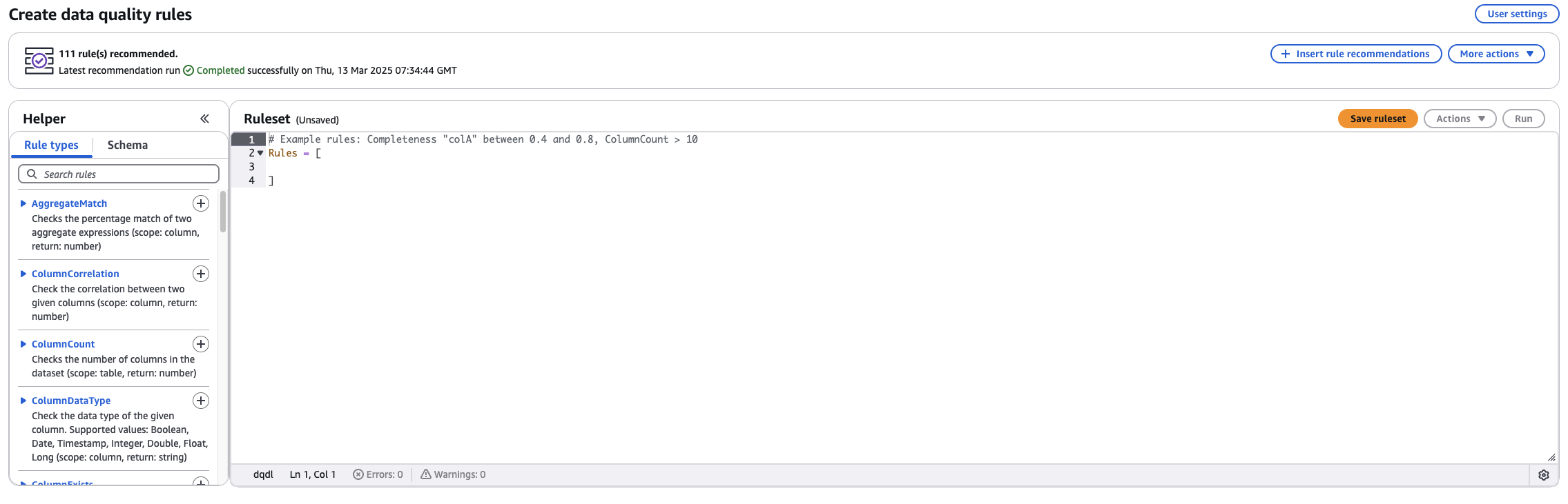 Data Quality 탭을 누른 후 Create data quality rules 를 선택한다.