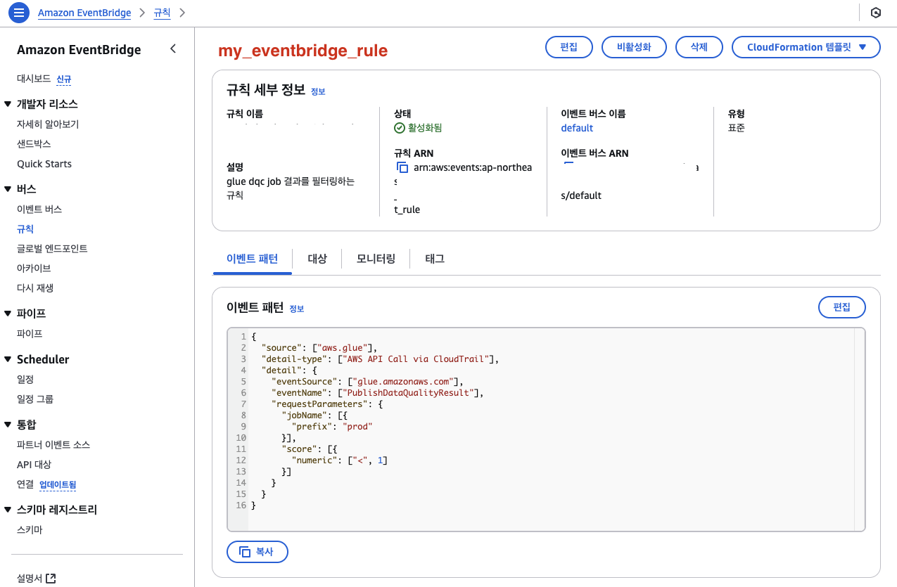 PublishDataQualityResult 인 것중 jobName 이 prod 로 시작하면서 DQC 결과 점수(score) 값이 1 미만일 때만 트리깅 되도록 규칙을 설정한 것이다. 즉, 품질 검사 결과가 모두 만족하지 못했을 때에만 트리깅 하는 것이다.{