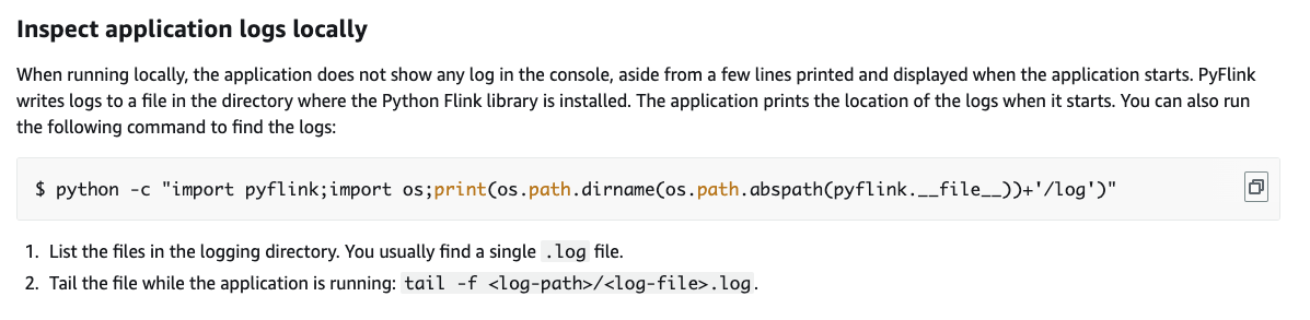$PYFLINK_HOME/log경로에 생기는.log파일을 이용하여 디버깅 하는 것이 좋다.- 참고 문서: Create and run a Managed Service for Apache Flink for Python application - Inspect application logs locally