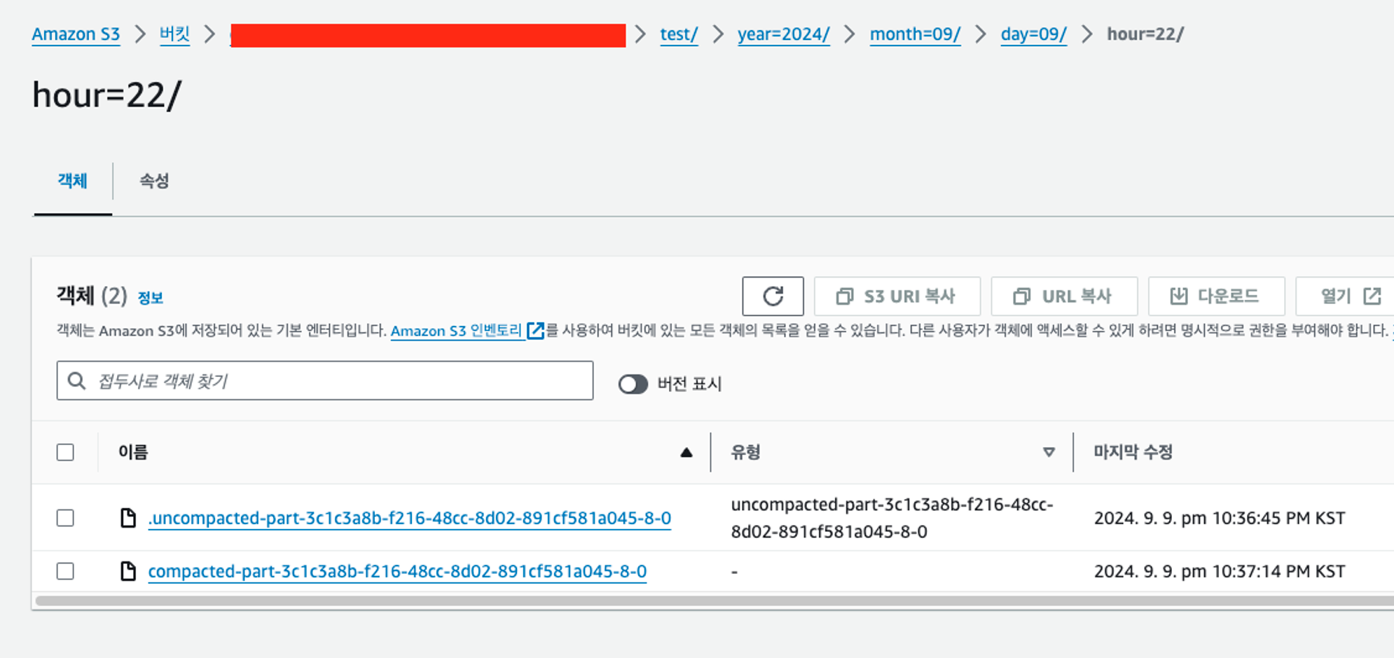 2024-09-09 22:37:13,416 INFO org.apache.flink.connector.file.table.utils.CompactFileUtils [] - Compaction time cost is '0.424S', output per file as following format: name=size(byte), target file is '{s3a://my-bucket/test/year=2024/month=09/day=09/hour=22/compacted-part-3c1c3a8b-f216-48cc-8d02-891cf581a045-8-0=125}', input files are '{s3a://my-bucket/test/year=2024/month=09/day=09/hour=22/.uncompacted-part-3c1c3a8b-f216-48cc-8d02-891cf581a045-8-0=125}'