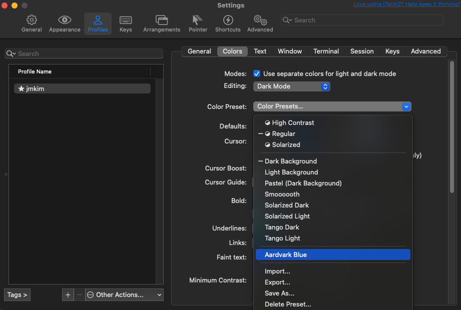 iTerm2 > Settings > Profiles > Colors > Color Preset > import 위치에서 다운로드 받은 Aardvark Blue.itermcolors 파일을 import 할 수 있다. 그리고 아래 이미지 처럼 선택하면 적용 된다.